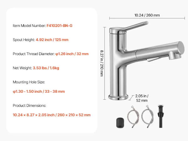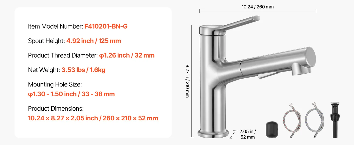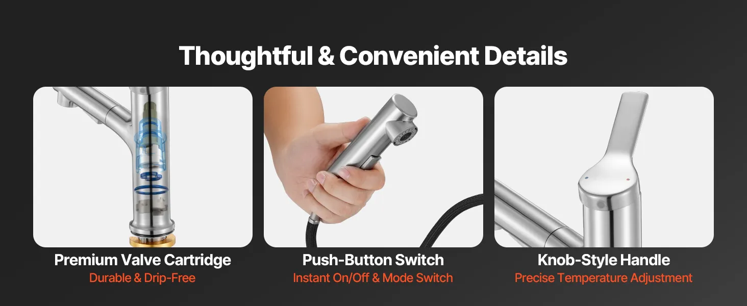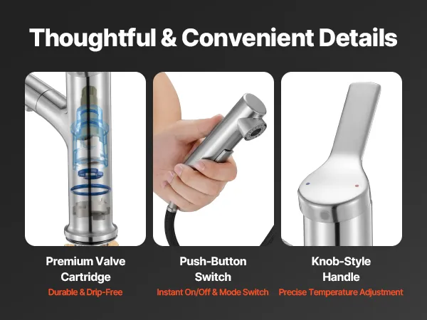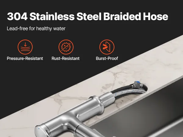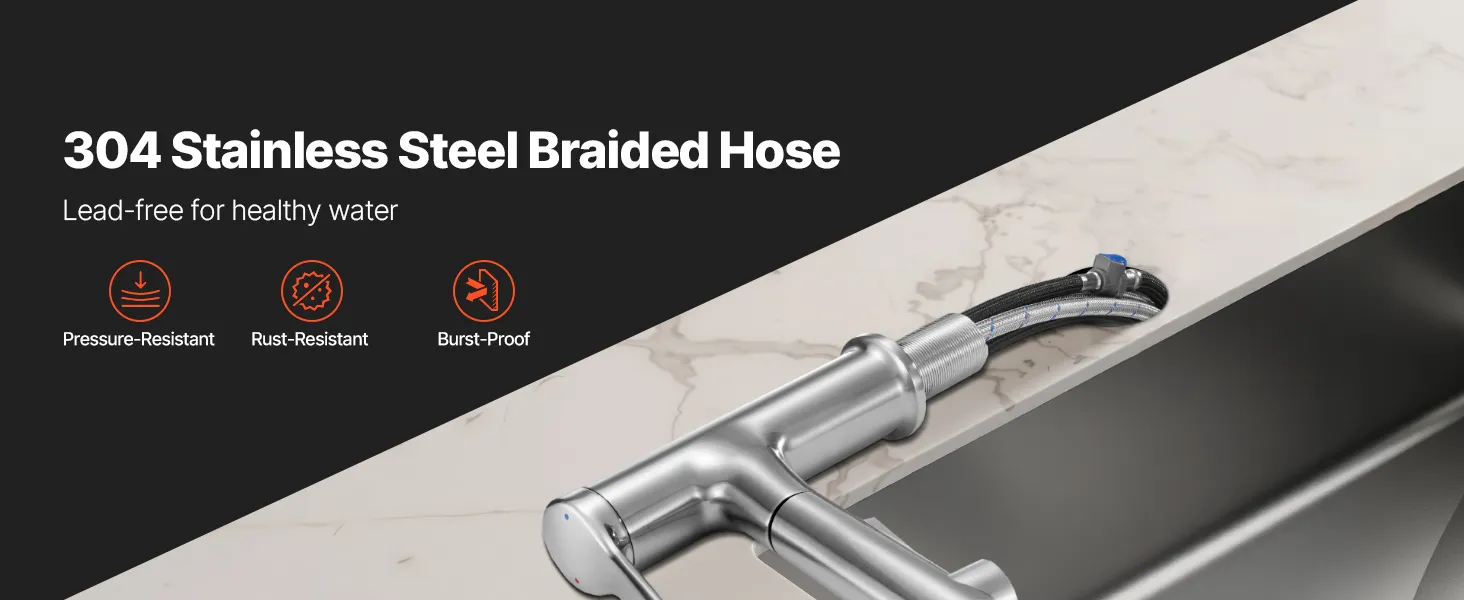 Lunga durata: realizzato con tubo flessibile intrecciato in acciaio inossidabile 304, questo rubinetto per lavello con spruzzatore è estremamente resistente, evita le perdite e garantisce un utilizzo duraturo