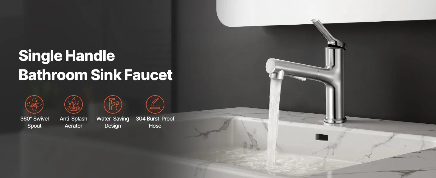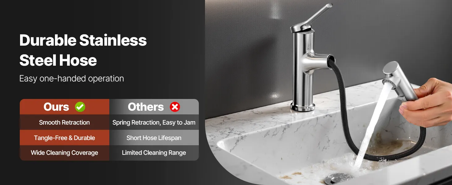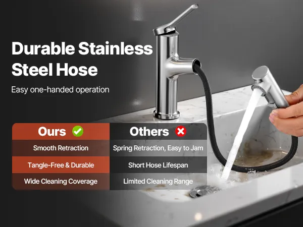 Il rubinetto da bagno è dotato di una sfera di gravità che garantisce un ritorno fluido e preciso dopo essere stato tirato verso il basso. Può essere facilmente esteso con una mano per coprire l'intera superficie del lavandino, migliorando l'efficienza e la praticità della pulizia.