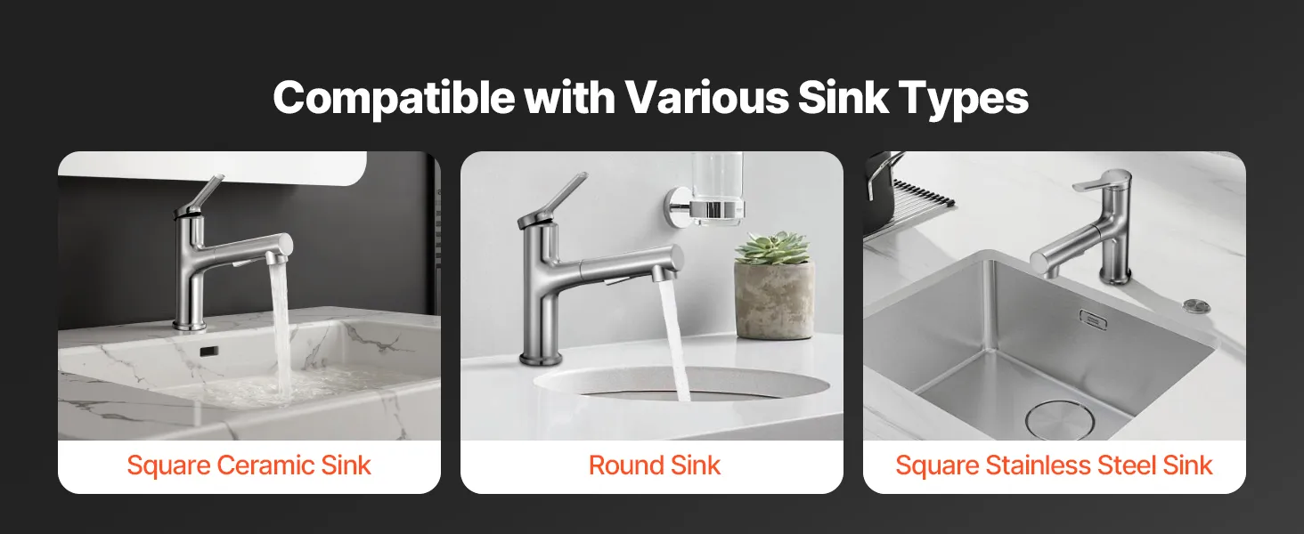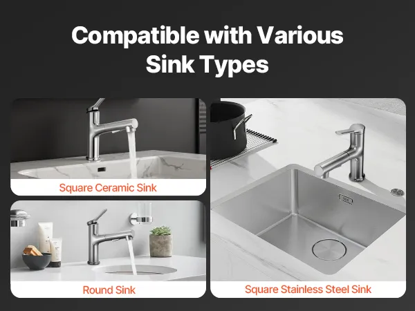 Questo rubinetto da cucina in acciaio inossidabile è progettato per essere flessibile e compatibile con diversi lavelli, inclusi modelli quadrati in ceramica, rotondi e in acciaio inossidabile.