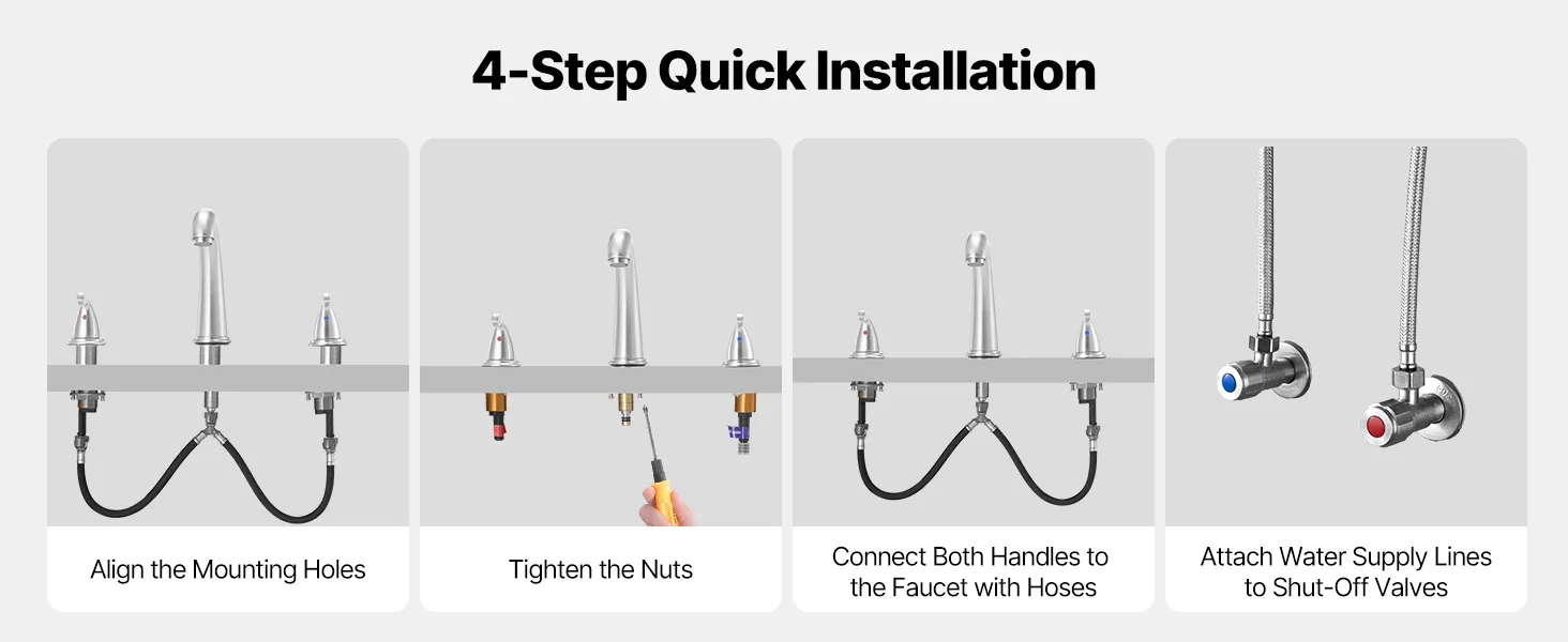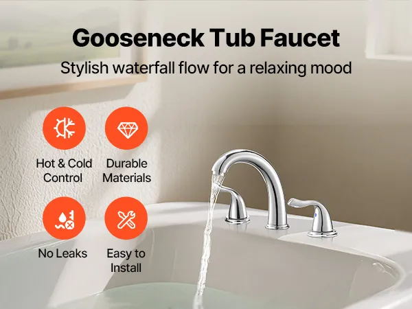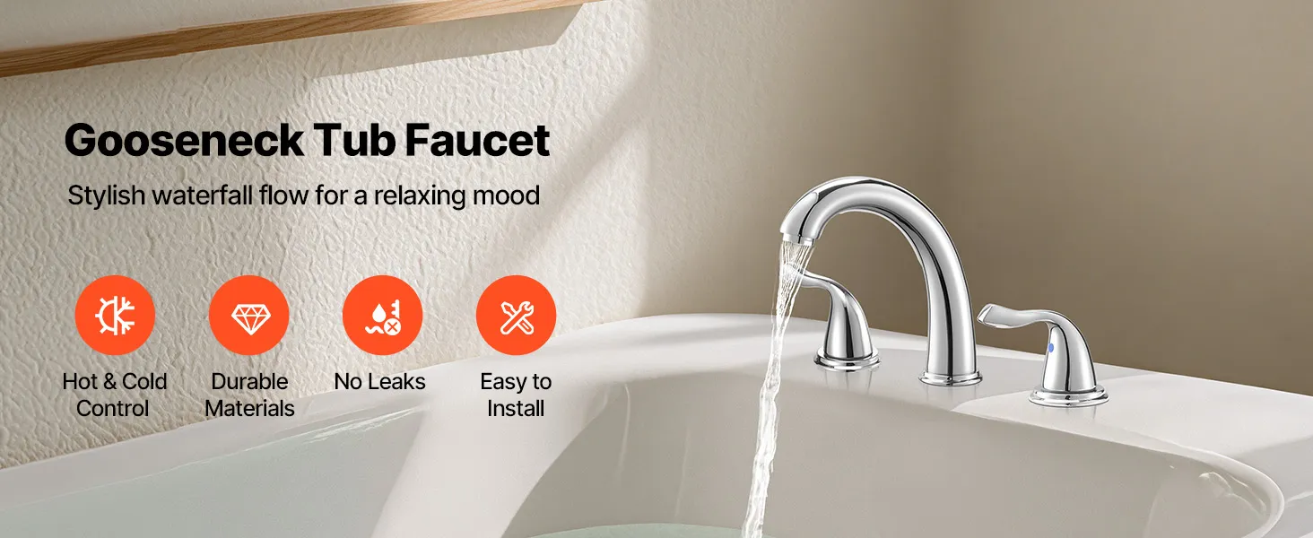 VEVOR Rubinetto per Vasca da Bagno con 3 Fori 2 Maniglie, Acciaio Inossidabile, Rubinetto Miscelatore per Vasca da Bagno con Beccuccio Alto, Collo d'Oca, Lavaggio Domestico, Argento