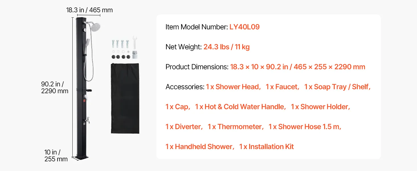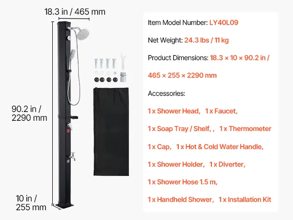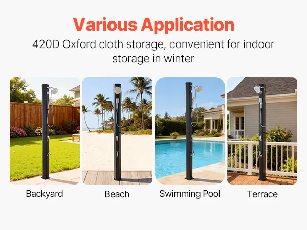 Doccia solare da 40 litri: Questa doccia solare da giardino è progettata per docce calde all'aperto sfruttando il calore solare. Con una capacità di 40 litri offre acqua calda e fredda regolabile per un'esperienza di doccia all'aperto ideale. Nota: è adatta solo per l'estate o l'autunno caldo, non per l'uso invernale
