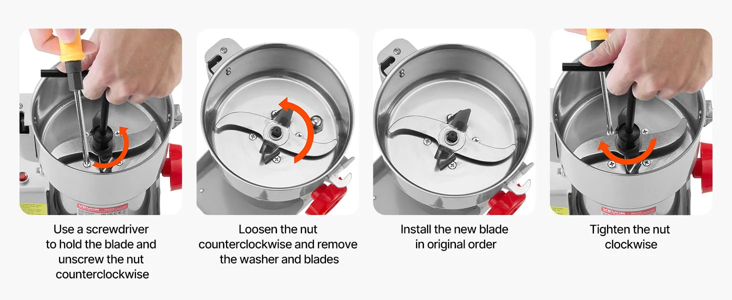 Macinatore multiuso per materiali secchi: il mulino elettrico per cereali elettrico è adatto per macinare cereali (grano, soia, mais, chicchi di caffè) e spezie (pepe, cannella, anice). Per gli ingredienti più duri, tagliarli prima