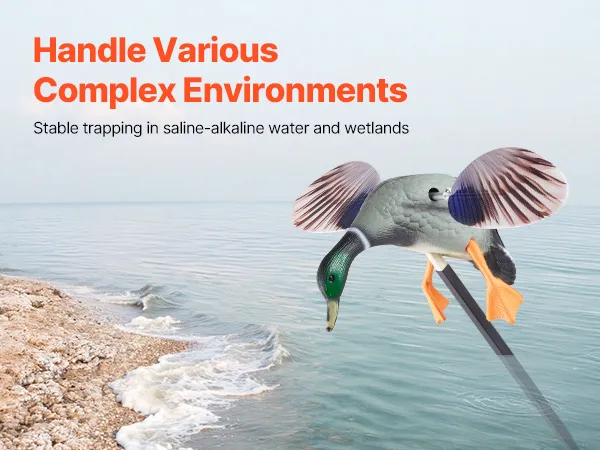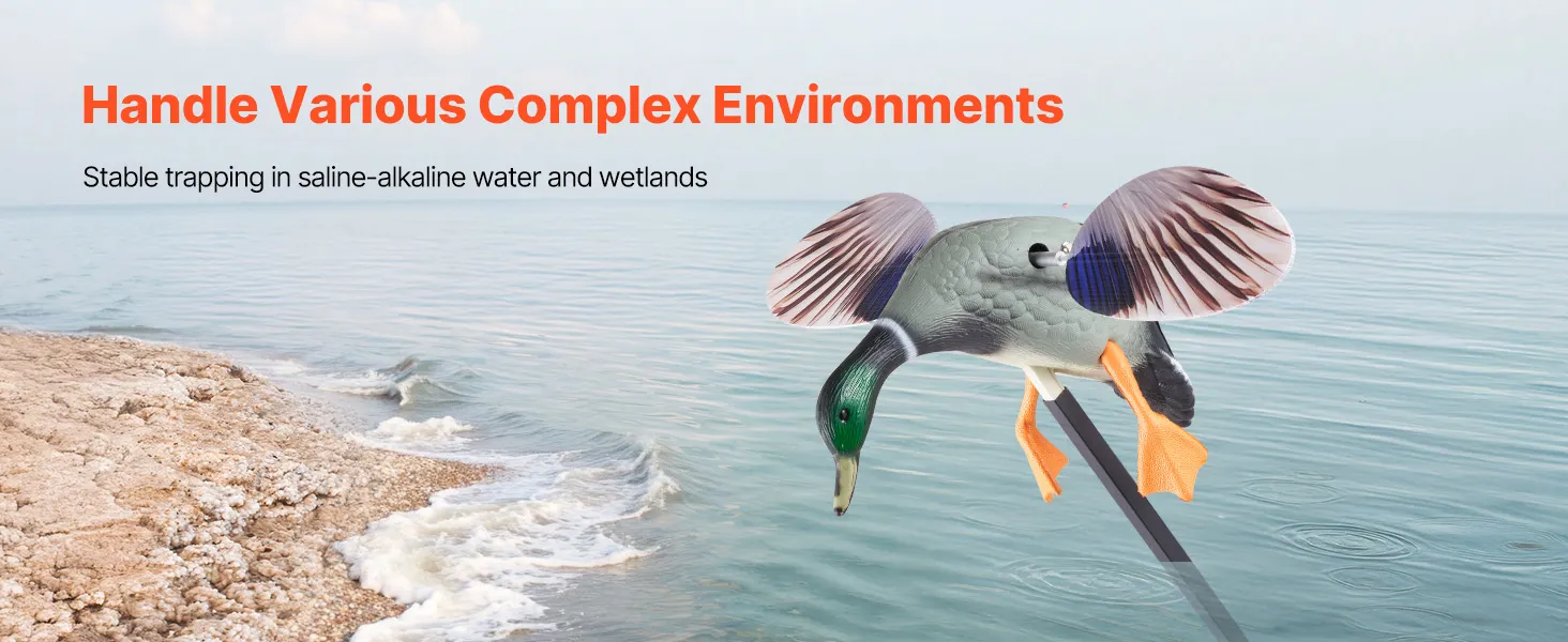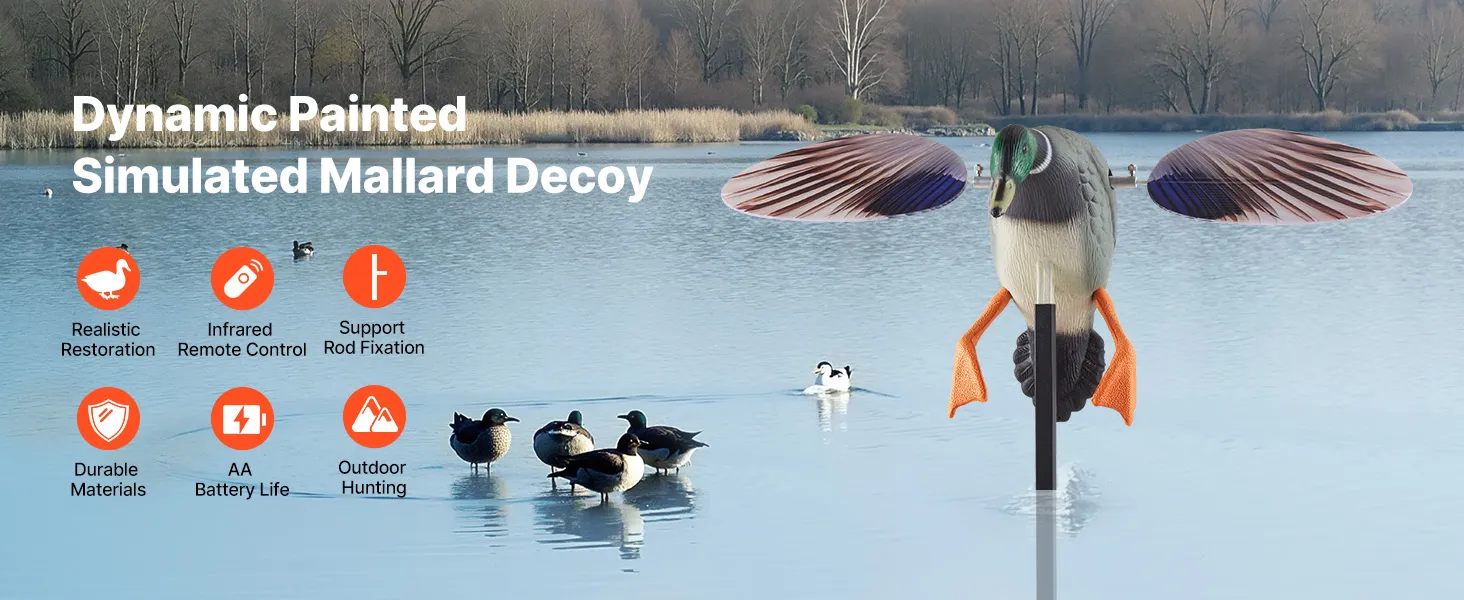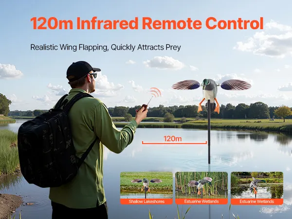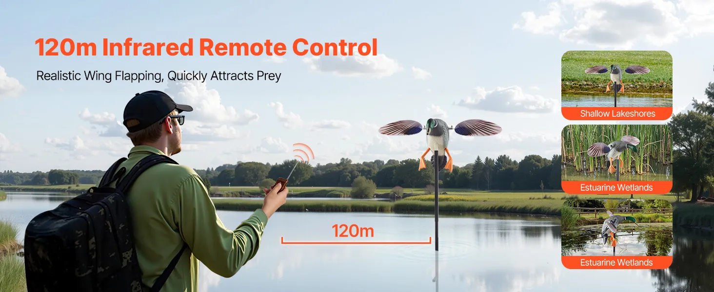 Questo richiamo per anatre può essere controllato con precisione da una distanza massima di 120 metri, il che lo rende ideale per l'uso su rive di laghi poco profondi, in zone umide vicino alle foci dei fiumi o in laghetti privati.