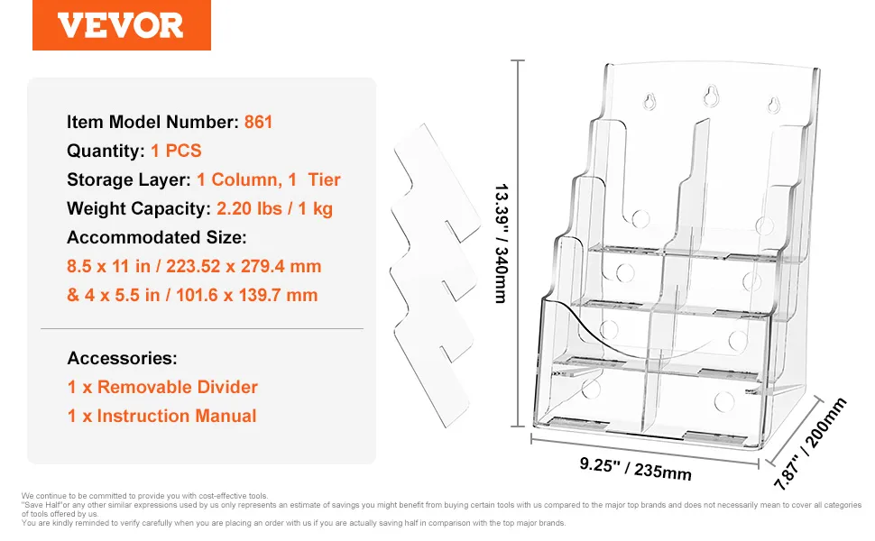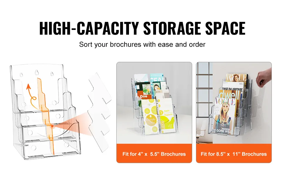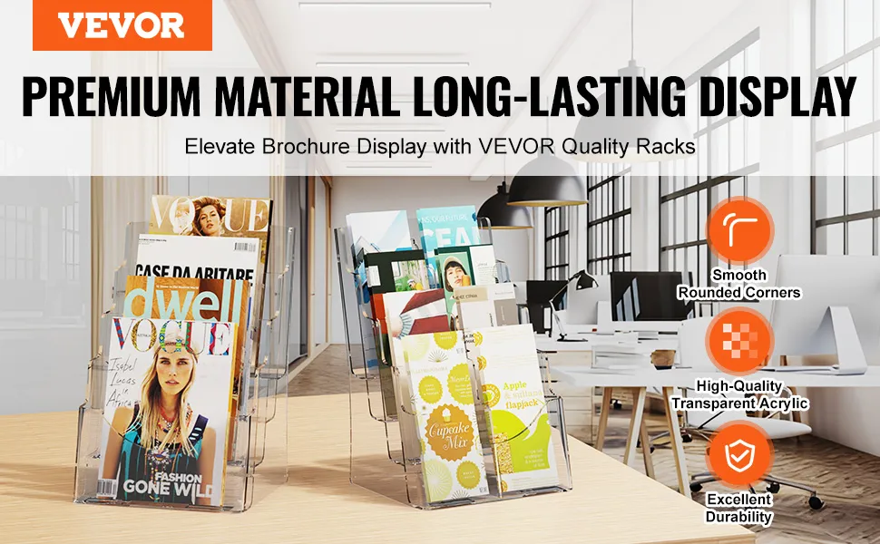 Il porta brochure in acrilico VEVOR è una soluzione durevole e versatile per le esigenze di esposizione. Realizzato in acrilico di alta qualità, garantisce resistenza contro rotture e graffi. Questo porta brochure è ideale per esporre informazioni in vari contesti, come uffici, esposizioni e spazi commerciali. La sua resistenza deriva dalle nervature rinforzate lungo la base, che rendono questo strumento affidabile per un uso intensivo. Il design consente un facile montaggio e smontaggio. Quindi, puoi trasportare e conservare facilmente i tuoi materiali esposti, assicurandoti che si distinguano chiaramente.