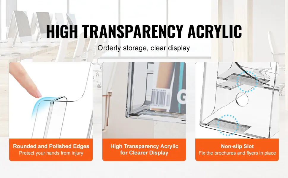 È realizzato in acrilico di alta qualità. Questo porta brochure è costruito per durare. Offre un'eccellente resistenza all'usura. Pertanto, è un'opzione affidabile per un uso prolungato. Il materiale non è solo durevole, ma anche facile da pulire. Ciò significa che il tuo display rimane incontaminato. L'elevata trasparenza dell'acrilico assicura che tutti i materiali esposti siano chiaramente visibili, migliorandone l'impatto. Grazie a questa robusta costruzione, puoi essere certo che questo supporto resisterà all'uso regolare; pertanto, è un investimento degno per le esigenze del tuo display.