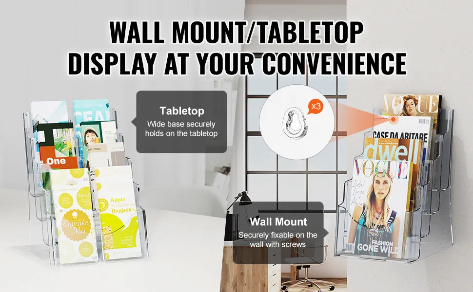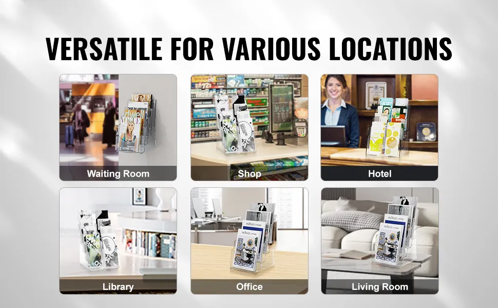 Il design in acrilico trasparente di questo espositore per depliant lo rende visivamente accattivante e professionale. È adatto sia per applicazioni da banco che da parete, dandoti la libertà di scegliere il posizionamento migliore per il tuo espositore. La trasparenza assicura che i tuoi materiali siano al centro dell'attenzione, senza distrazioni dal supporto stesso. Questa flessibilità nelle opzioni di montaggio lo rende un'aggiunta versatile a qualsiasi ambiente. Sia che venga posizionato su un bancone o montato su pareti, l'espositore è stabile e sicuro.