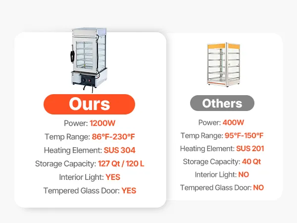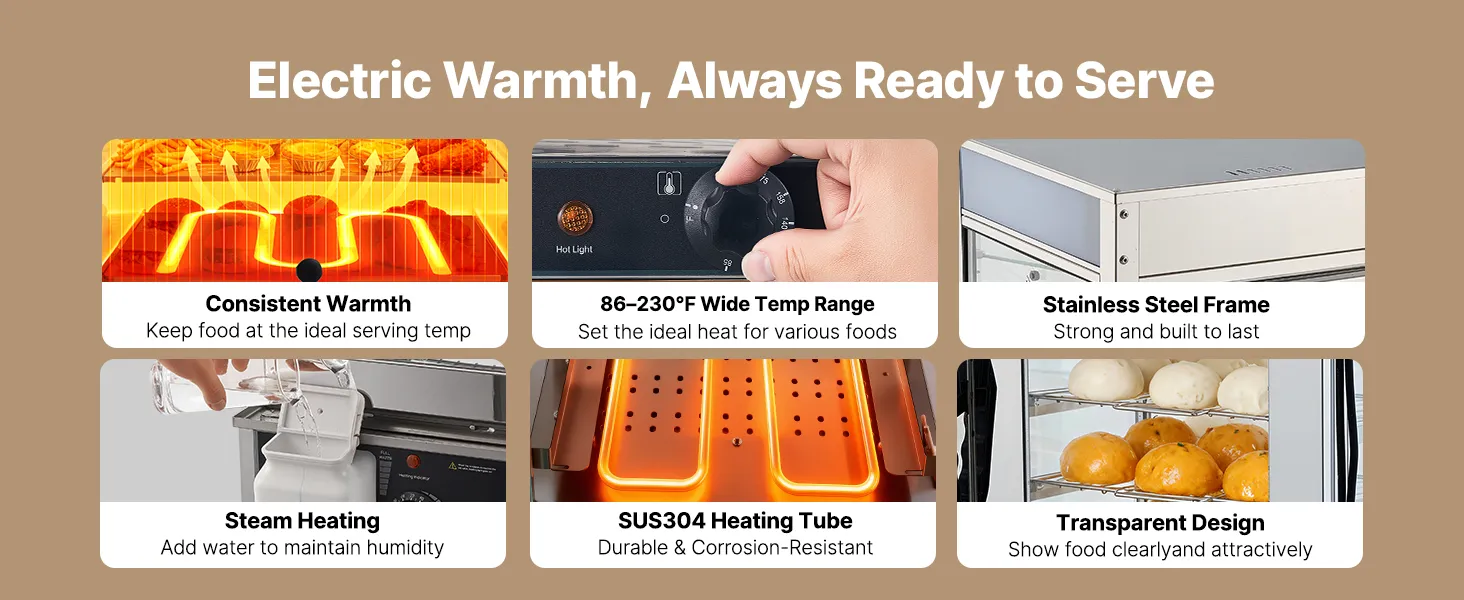 Design multifunzionale: lo scaldavivande con display a vapore combina riscaldamento, cottura a vapore e presentazione in un'unica unità per un utilizzo pratico. Nota: solo per riscaldare gli alimenti, non per cuocerli