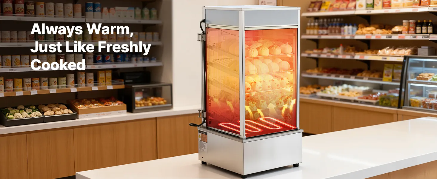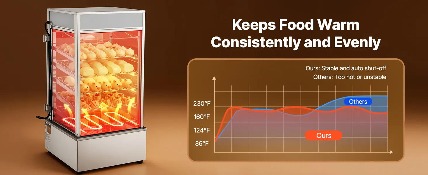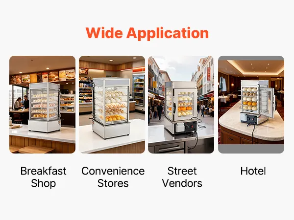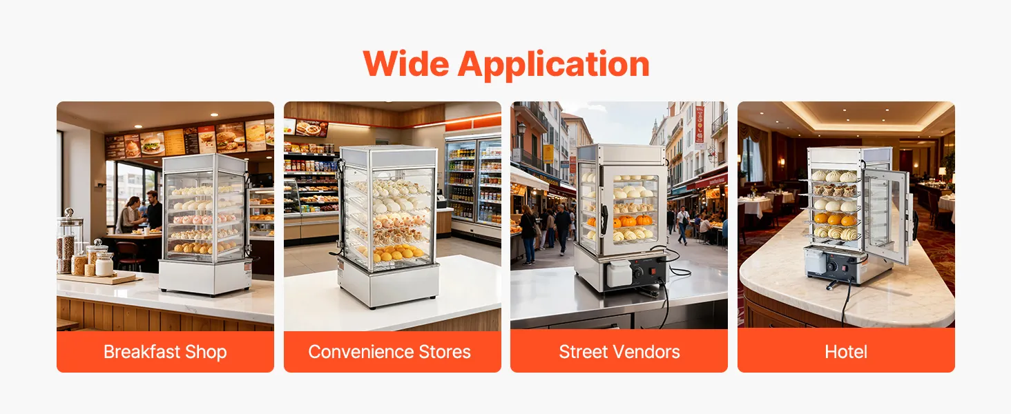 Ampia gamma di applicazioni: adatto per cuocere a vapore panini, mais, arachidi e vari alimenti al vapore. Ideale per minimarket, bar per la colazione, snack bar, hotel e altri servizi di ristorazione commerciale
