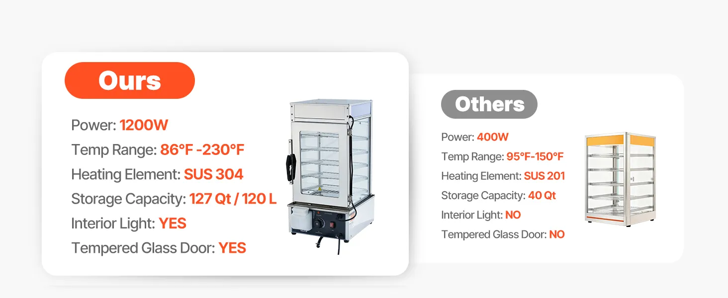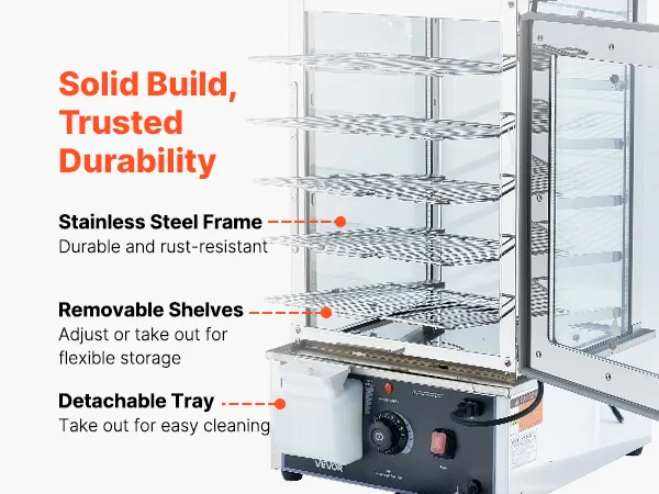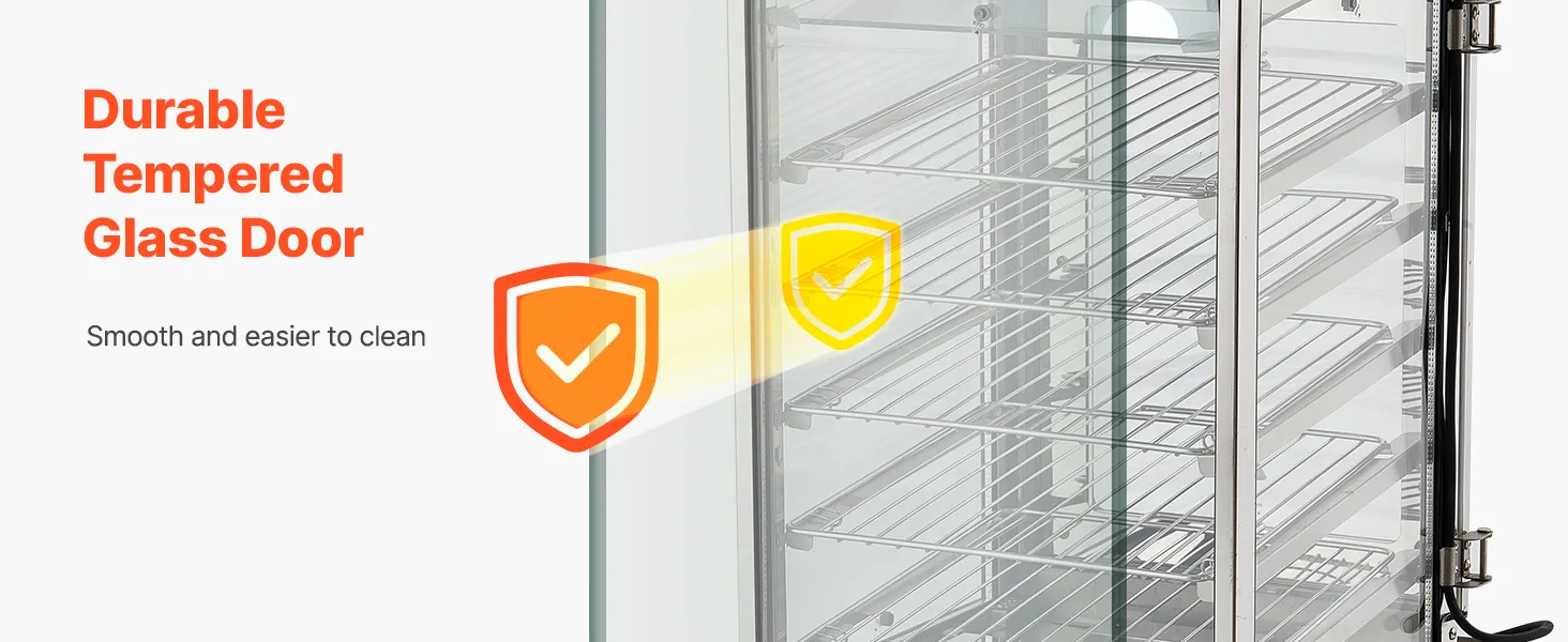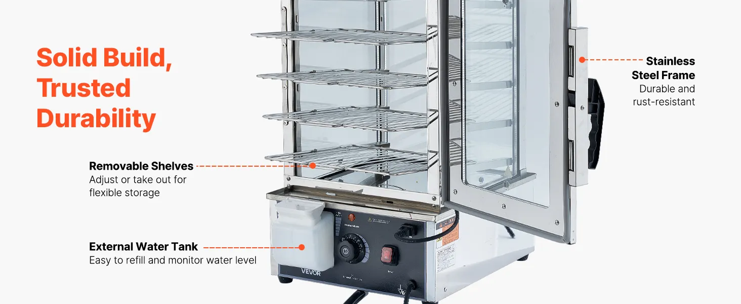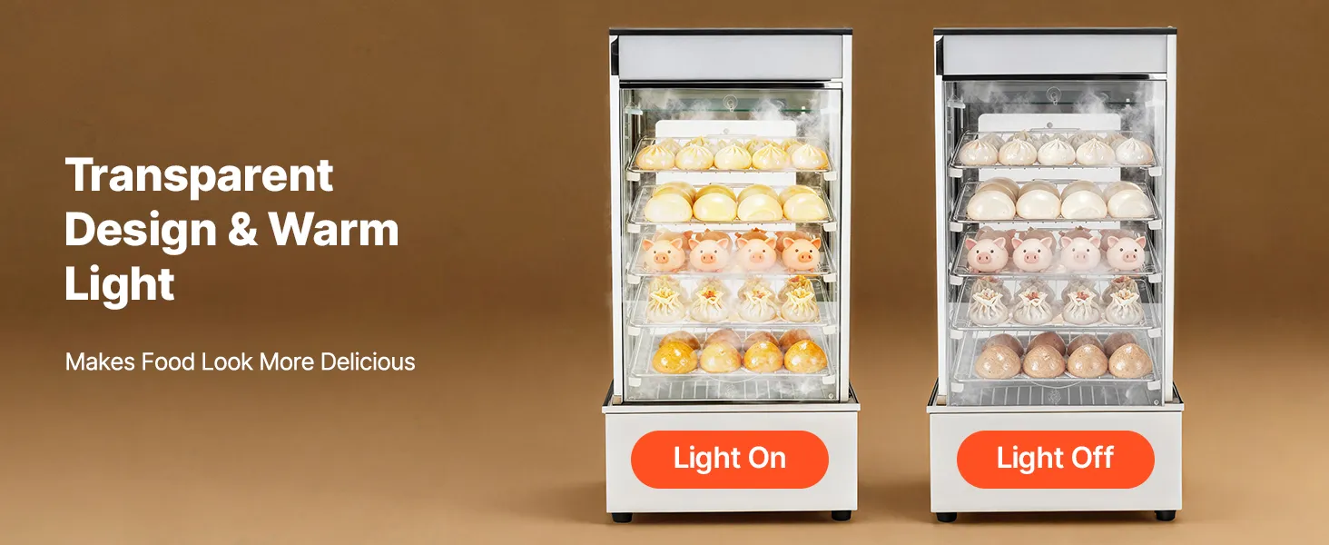 Ampia capacità a 5 ripiani: 5 ripiani spaziosi che possono contenere circa 50-60 panini. I ripiani rimovibili consentono un facile accesso e il design leggermente inclinato impedisce alle gocce d'acqua di bagnare i panini