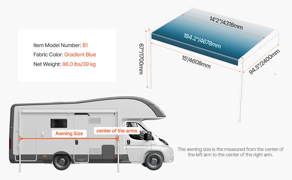 VEVOR Tenda da Sole di Ricambio Impermeabile in Vinile per Camper, Tenda da Sole Retrattile Modulare con Telaio in Lega di Alluminio, Blu Sfumato, Manuale 4572 mm Adatta Maggior Camper