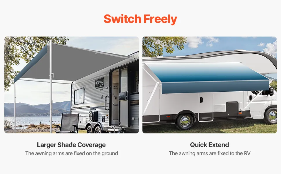 Regola rapidamente i bracci di supporto cambiando le staffe di installazione. Quando è fissata a terra, la tenda sostitutiva per camper offre una gamma di ombreggiatura più ampia. Quando è attaccata al camper, si estende e si ritrae facilmente.