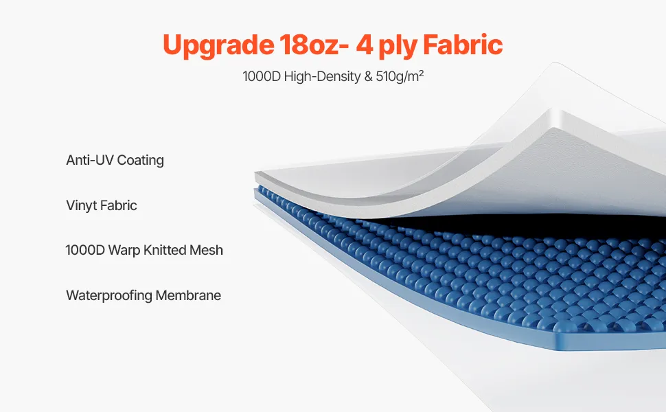 Il tessuto in PVC a 4 strati da 18oz migliorato è durevole e resiste al sole, alle intemperie e ai detergenti meglio di altri materiali. Ciò significa che puoi fidarti che la tua tenda da sole duri più a lungo e funzioni bene.