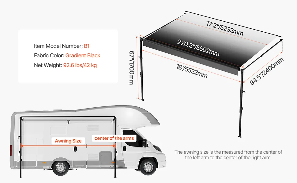 VEVOR Tenda da Sole di Ricambio Impermeabile in Vinile per Camper, Tenda da Sole Retrattile Modulare con Telaio in Lega di Alluminio, Nero Sfumato, Manuale 5846 mm Adatta Maggior Camper