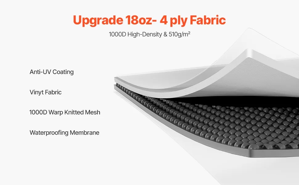 Il tessuto in PVC a 4 strati da 18oz migliorato è durevole e resiste al sole, alle intemperie e ai detergenti meglio di altri materiali. Ciò significa che puoi fidarti che la tua tenda da sole duri più a lungo e funzioni bene in varie condizioni esterne.