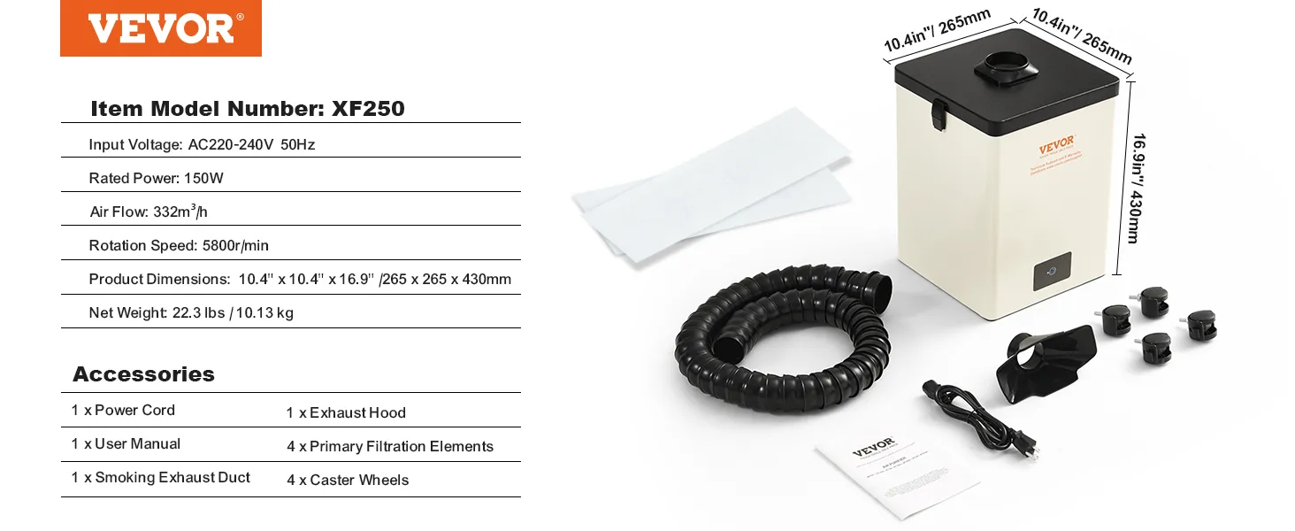 Aspiratore fumi di saldatura VEVOR, con motore da 150W e portata d'aria di 332m³/h, è in grado di rimuovere rapidamente fumi e particelle nocive. Il filtro a 3 strati e il tasso di purificazione del 99,99% mantengono il tuo spazio di lavoro pulito, sicuro e sano.