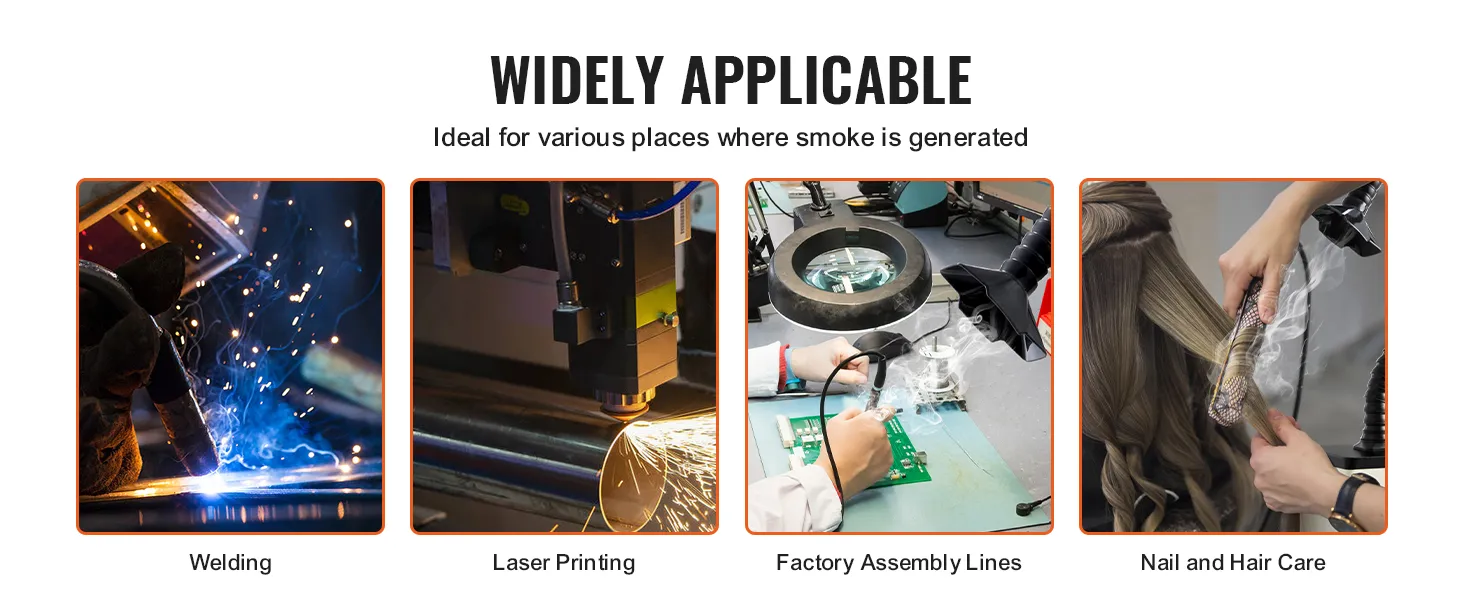 Il nostro assorbitore di fumo di saldatura è compatto per vari spazi per la rimozione del fumo, l'assorbimento della polvere, la purificazione del fumo laser, la rimozione dei gas nocivi, saloni di bellezza, studi di unghie, stampa e saldatura.