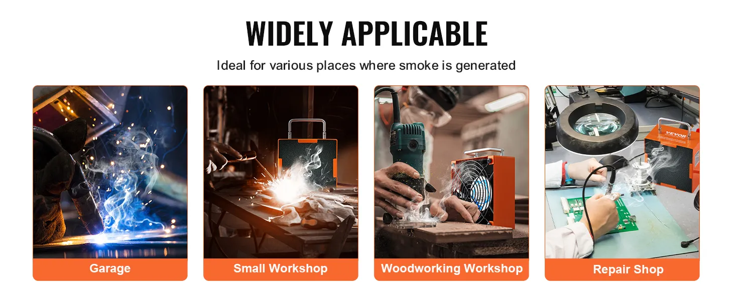 Il nostro assorbitore di fumo di saldatura è compatto, il che lo rende adatto a vari spazi che producono fumo per saldatura, pirografia, stampa 3D, lavorazione di vetrate, artigianato, saloni di bellezza, lavorazione del legno, creazione di gioielli.