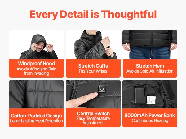 Trattenimento del calore: questa giacca riscaldata è realizzata in tessuto esterno ad alta densità con imbottitura in cotone di alta qualità per un'eccellente protezione termica. Il cappuccio antivento, i polsini e l'orlo elastici isolano dall'aria fredda