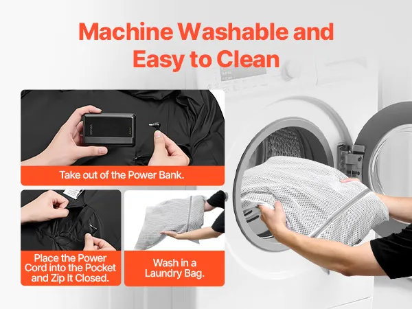 Questa giacca da lavoro riscaldata, realizzata in tessuto ad alta densità e resistente, è lavabile in lavatrice. Basta rimuovere la batteria, collegare il cavo e lavare il tutto in lavatrice.
