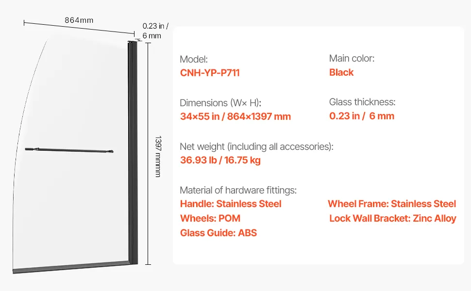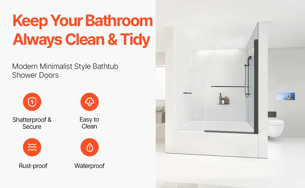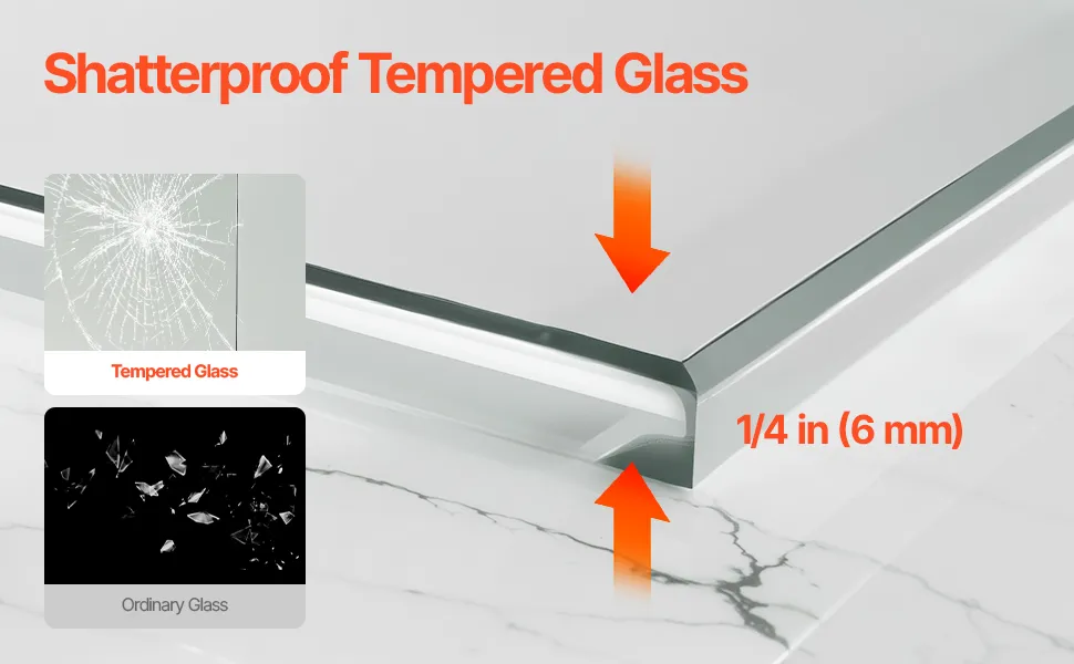 Robusto e sicuro: realizzato in vetro temperato infrangibile spesso 0,23 pollici/6 mm, questa porta doccia per vasca senza telaio soddisfa gli standard SGCC. Anche nel raro caso di rottura, il vetro rimane intatto senza frantumarsi, offrendoti la massima protezione