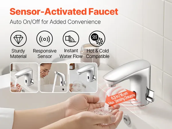 Questo rubinetto per lavabo è dotato di un sensore a infrarossi reattivo: l'acqua scorre automaticamente quando le mani si avvicinano e si ferma quando si allontanano. Affidabile ed efficiente, non richiede alcun contatto manuale.