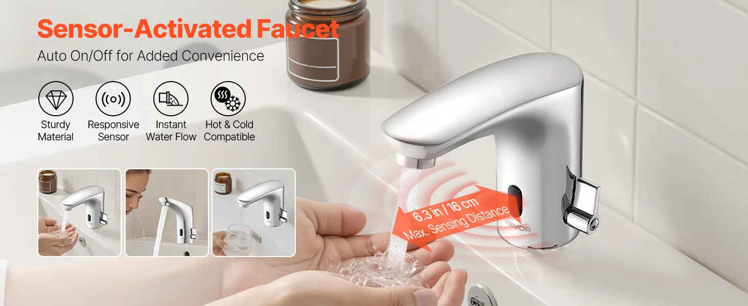 VEVOR Rubinetto per Lavabo Senza Contatto, Rubinetto Automatico con Sensore a Batteria per Bagno Miscelatore Maniglia Singola Regolabile a Mani Libere, Acqua Fredda e Calda, Argento Cromato