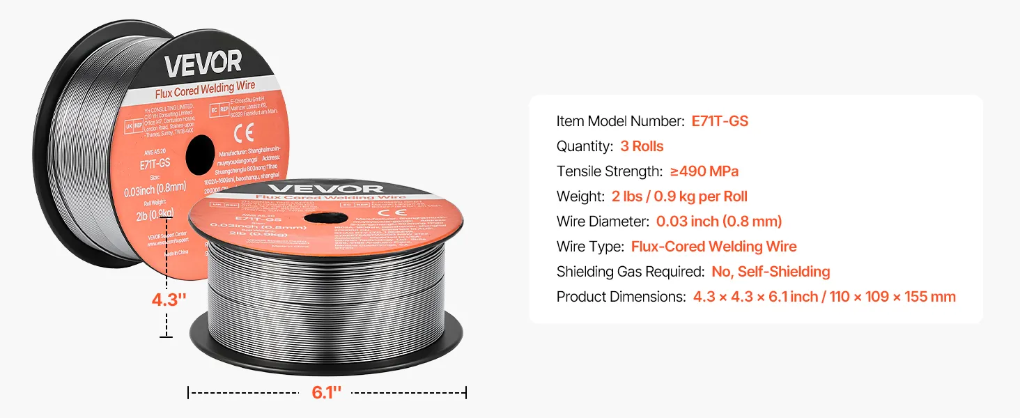 VEVOR Filo MIG per Saldatura, E71T-GS 0,8 mm 0,9 kg, in Acciaio Dolce Senza Gas con Pochi Schizzi per Saldatura ad Arco in Tutte le Posizioni, Autoprotetto per Uso Esterno, Confezione da 3 Rotoli