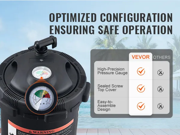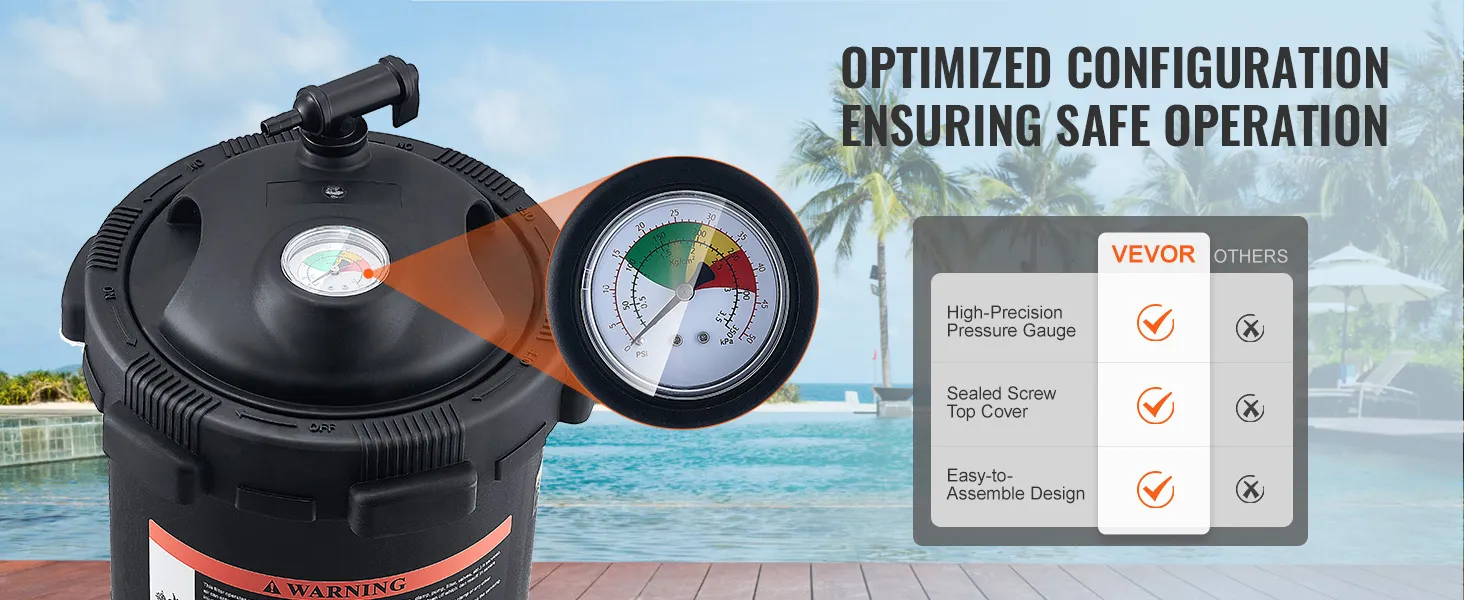 Manometro e valvola di sicurezza inclusi: il filtro è dotato di un manometro preciso, che consente di monitorare lo stato della pressione in tempo reale, garantendo un funzionamento stabile dell'apparecchiatura.