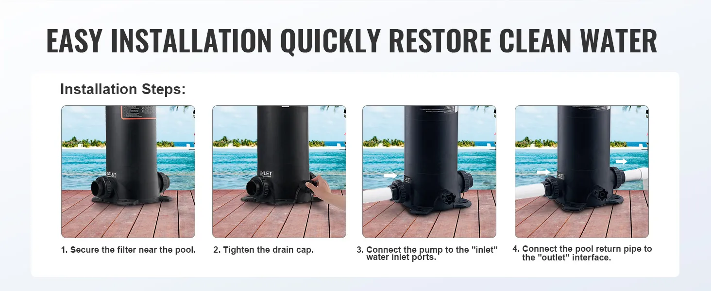 Montaggio rapido in tre fasi: per prima cosa, fissa il filtro vicino alla piscina, quindi collega il tubo della pompa a una delle entrate dell'acqua "in entrata" e, infine, collega il tubo di ritorno della piscina alla porta "outlet".