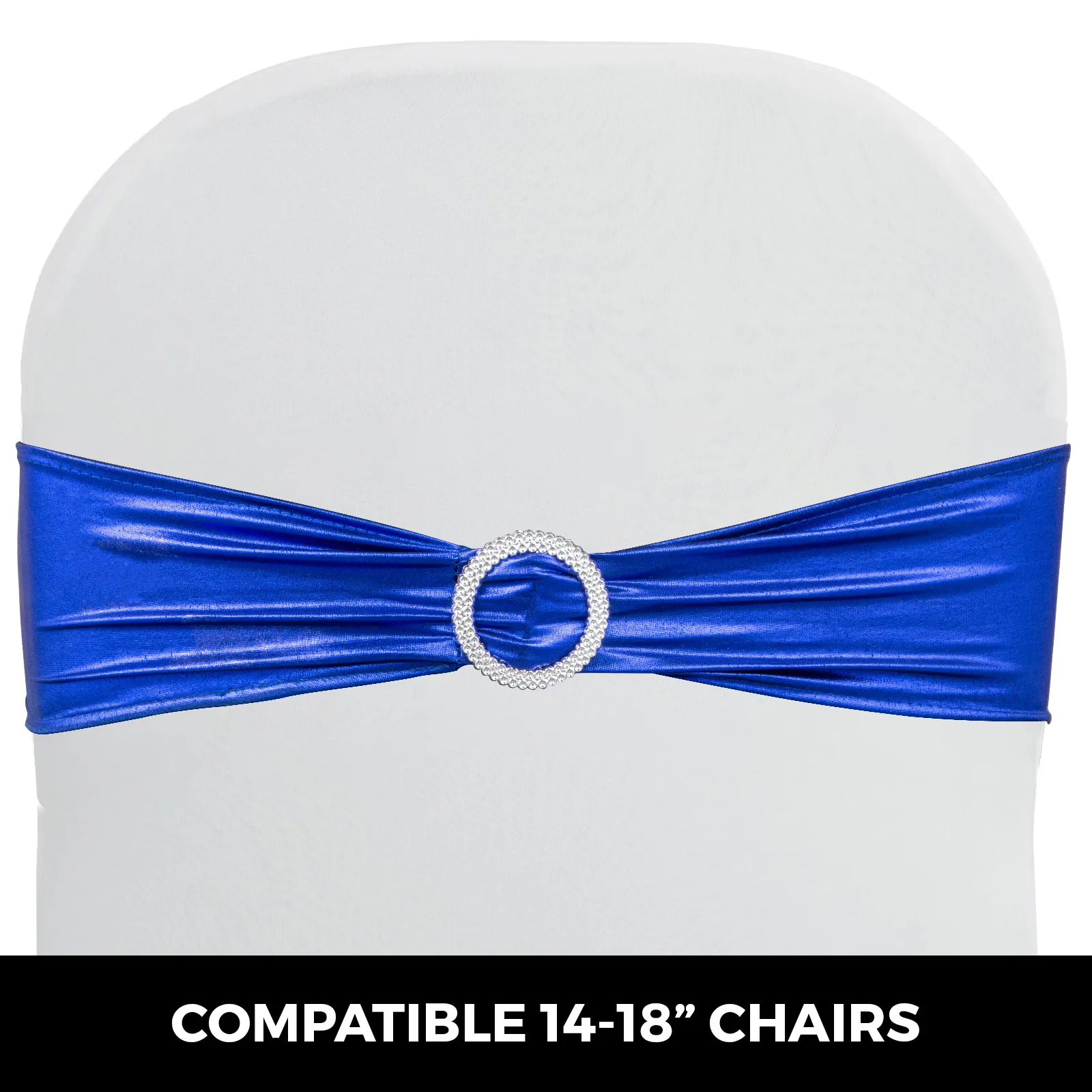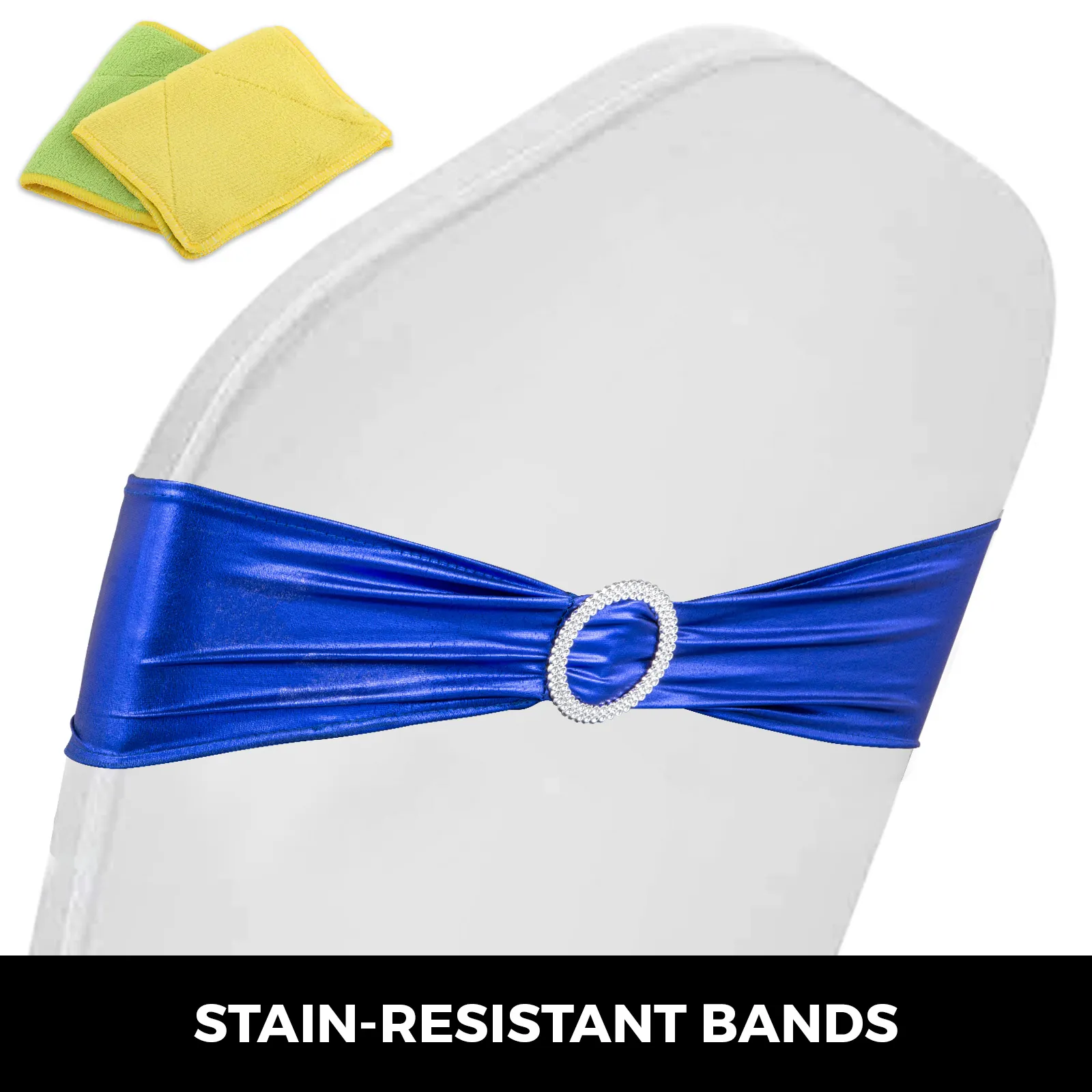 Ogni fascia della copertura della sedia è con un cursore argento fibbia rotonda. Che può essere spostato ma non rimosso. Aspetto brillante, aggiungi decorazioni speciali.