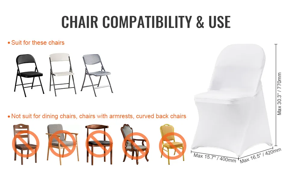 Compatibilità con più sedie: le fodere per sedie pieghevoli in spandex elasticizzato sono di dimensioni moderate e possono essere montate sulla maggior parte delle sedie, comprese sedie da pranzo, sedie impilabili, sedie per banchetti e sedie pieghevoli.