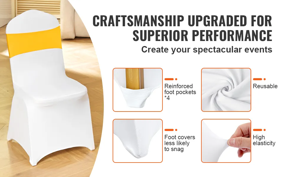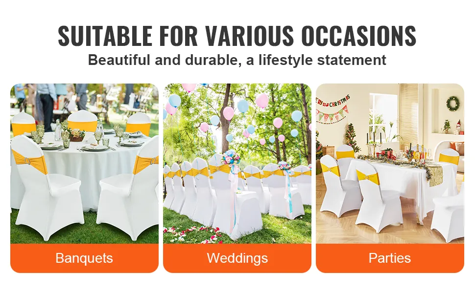 Le fodere per sedie in spandex elasticizzato di VEVOR offrono una soluzione elegante e pratica per i posti a sedere per eventi. Queste fodere sono realizzate con una miscela di alta qualità di 95% fibra di poliestere e 5% spandex, che garantisce flessibilità e durata. Il materiale elastico consente una vestibilità aderente su vari tipi di sedie, conferendo un aspetto liscio e senza pieghe al tuo spazio per eventi. Che tu stia organizzando un matrimonio, una festa o un incontro aziendale, queste fodere offrono un'eccellente protezione contro versamenti, graffi e macchie, rendendole ideali sia per eventi al chiuso che all'aperto. Il loro design facile da usare crea un'atmosfera raffinata e coesa che esalta l'arredamento generale del luogo.