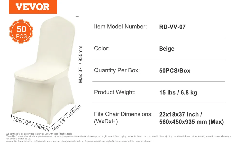 Le fodere per sedie in spandex elasticizzato VEVOR sono disponibili in un elegante colore bianco avorio. Questo colore aggiunge raffinatezza e classe a qualsiasi luogo. Si adatta a vari temi di eventi e stili di arredamento, rendendolo una scelta versatile. Il colore bianco avorio offre un aspetto pulito e fresco che esalta l'estetica generale del tuo spazio per eventi. Perfette per matrimoni, banchetti e riunioni di lusso, queste fodere aiutano a dare il tono a una celebrazione elegante e indimenticabile.