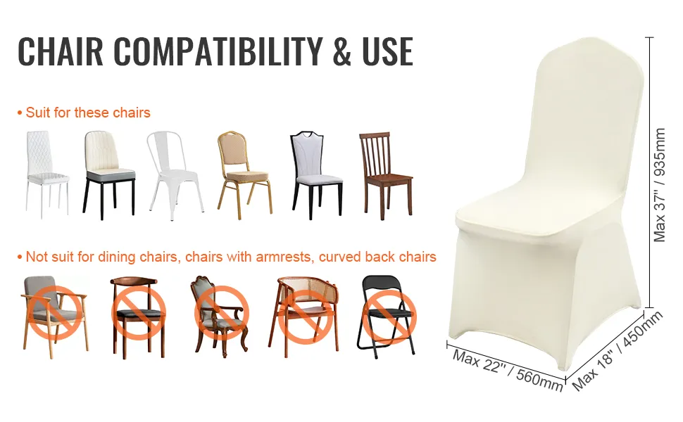 Il design universale di queste fodere per sedie assicura una vestibilità perfetta per un'ampia gamma di dimensioni di sedie, comprese quelle con dimensioni fino a 22x18x37 pollici. Il materiale elastico in spandex si estende comodamente su diversi tipi di sedie. Queste fodere sono abbastanza versatili da essere utilizzate per qualsiasi evento, offrendo un aspetto sicuro ed elegante. Il design aderente assicura che non ci sia tessuto in eccesso, mantenendo le sedie pulite e lucide. Che si tratti di matrimoni o feste, queste fodere creeranno un'atmosfera sofisticata.