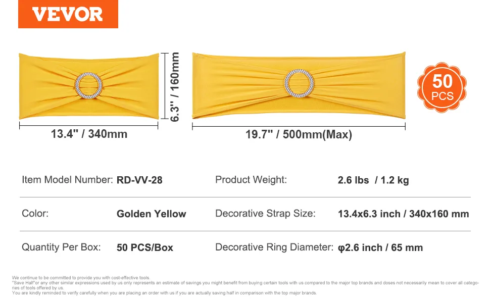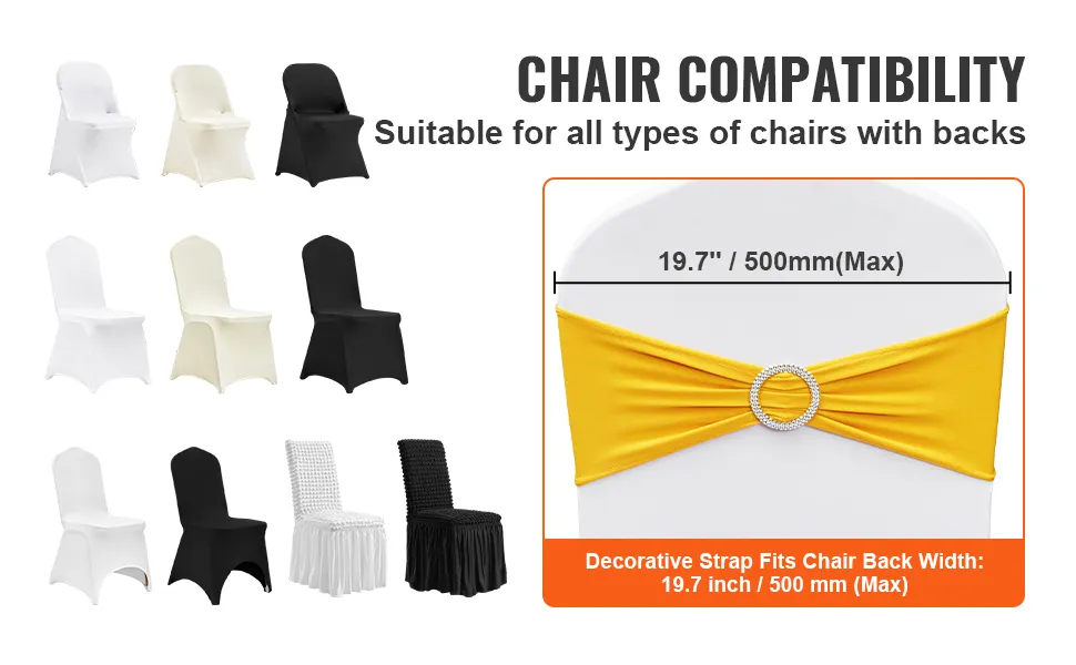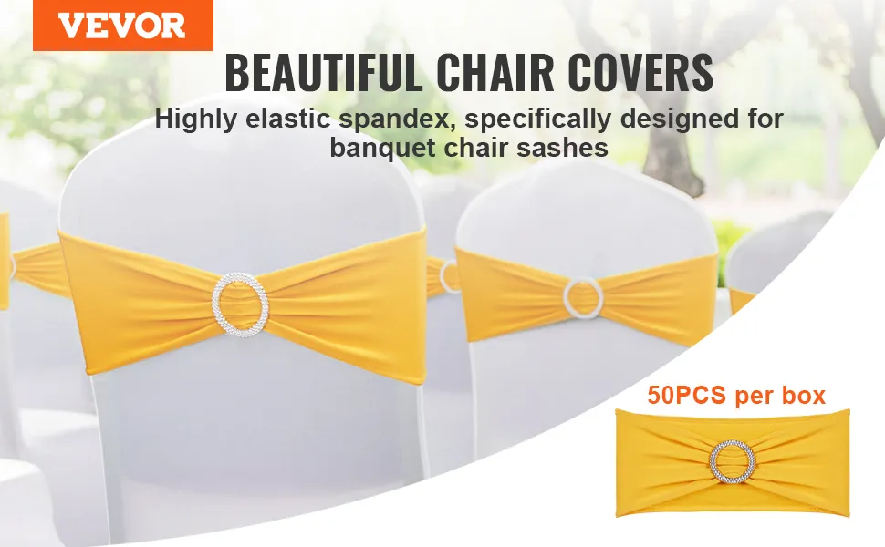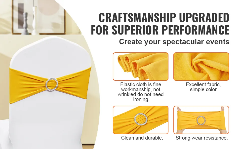 Le fasce per sedie in spandex elasticizzato VEVOR offrono una soluzione conveniente per la decorazione delle sedie per feste. Queste fasce per sedie giallo oro aggiungono eleganza a qualsiasi celebrazione pur essendo convenienti. Offrono un aspetto professionale e coordinato per i decoratori di eventi senza superare i limiti di budget. Queste fasce sono facili da installare, durevoli e riutilizzabili, offrendo valore a lungo termine. Sono una fantastica aggiunta a qualsiasi allestimento per eventi, trasformando una stanza di base in uno spazio splendidamente decorato senza gli alti costi di un arredamento costoso.