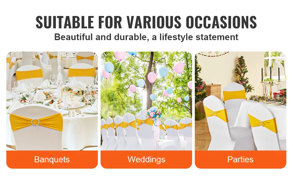 Le fasce per sedie in spandex elasticizzato VEVOR aggiungono raffinatezza a qualsiasi decorazione per eventi, rendendole perfette per i matrimoni. L'elegante colore giallo dorato e il design con fibbia rotonda esaltano l'atmosfera e ne esaltano l'atmosfera. Queste fasce aiutano a creare un look elegante e coordinato, trasformando qualsiasi spazio per eventi in un ambiente di lusso. Che si tratti di un matrimonio, di un banchetto o di una festa, le fasce aggiungono un tocco di classe, assicurando che il tuo luogo abbia un aspetto impeccabile. Sono una decorazione ideale per sedie da matrimonio per creare un tema elegante e senza soluzione di continuità.