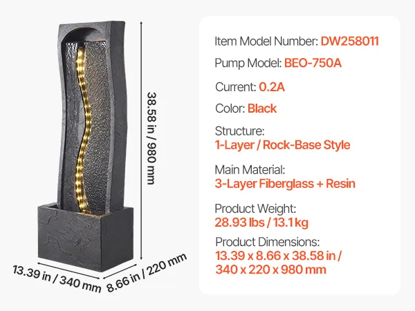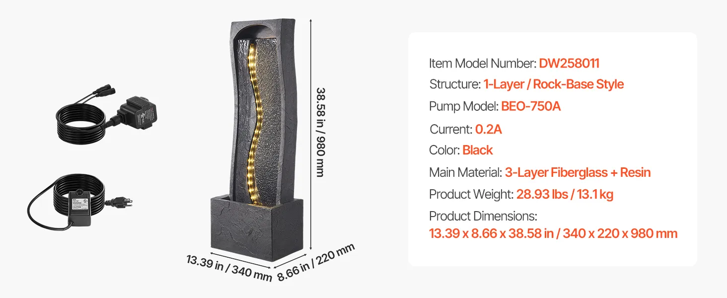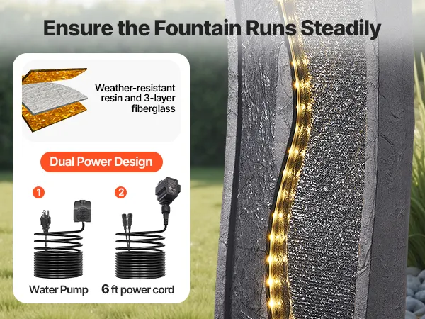 VEVOR Fontana da Esterno, Fontana e Cascata da 340 x 220 x 980 mm, Fontane a 1 Livello con Base in Pietra da Pavimento con Luce LED e Pompa, per Esterni, Interni, Giardino, Casa, Patio e Cortile