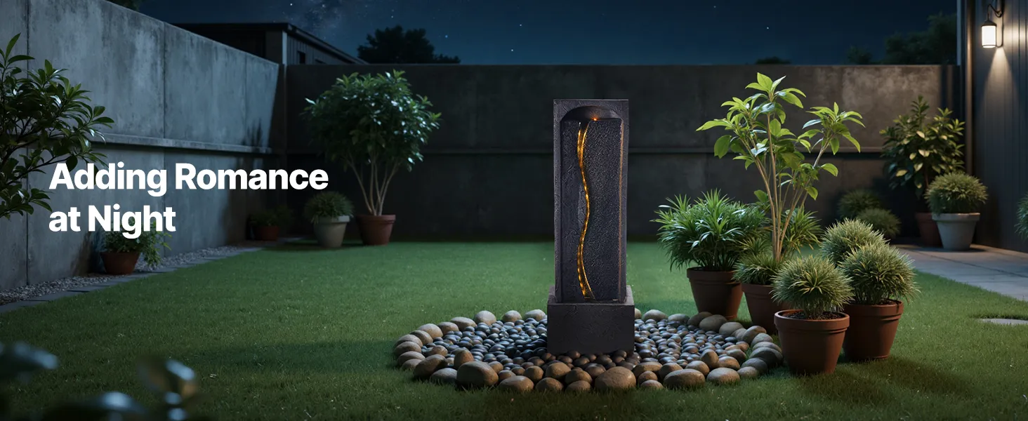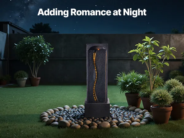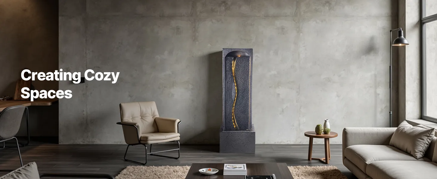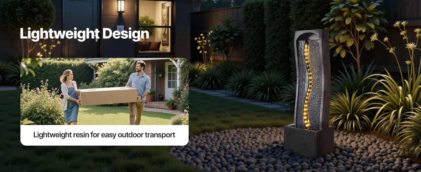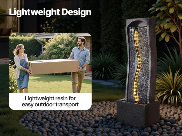 Questo moderno design verticale presenta eleganti linee artistiche e una calda illuminazione a LED, valorizzando gli spazi interni ed esterni. Realizzato in resina resistente e fibra di vetro a triplo strato, è resistente alle intemperie e di facile manutenzione. Ideale per uffici, sale di meditazione, patii e giardini.