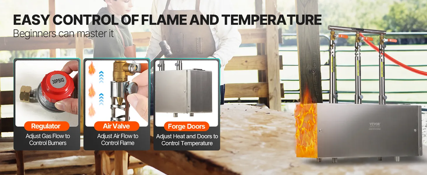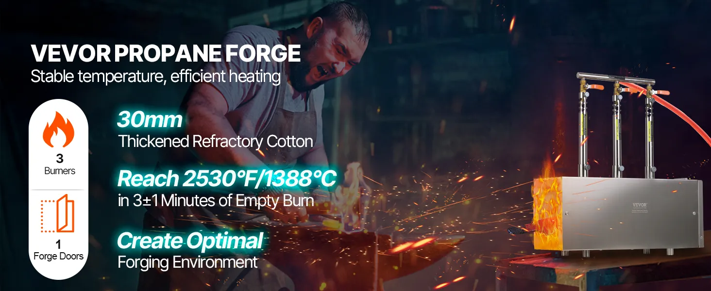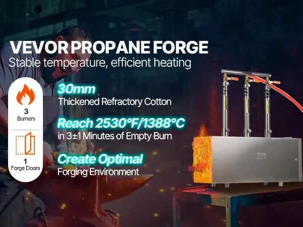 Riscaldamento efficiente e temperatura stabile: Il cotone refrattario da 3 cm di questa forgia portatile a propano concentra il calore e riduce le perdite. Con tre potenti bruciatori, offrendo un ambiente ideale per la forgiatura di utensili metallici di alta qualità