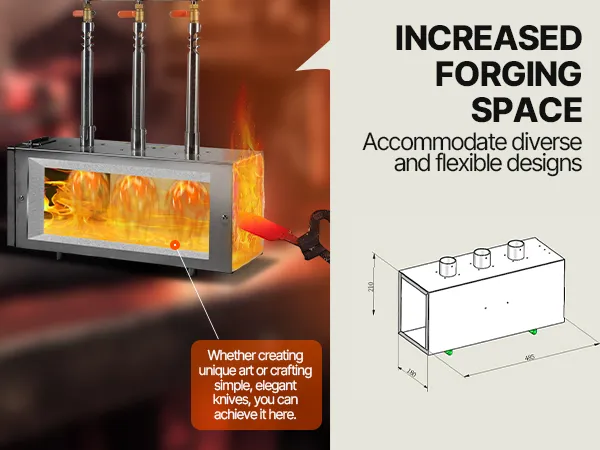 Spazio più ampio e carico flessibile: Il design squadrato della fucina crea un interno più alto e spazioso per vari materiali metallici. Lo spazio interno ottimizzato migliora anche l'efficienza del riscaldamento, supportando diverse esigenze di forgiatura