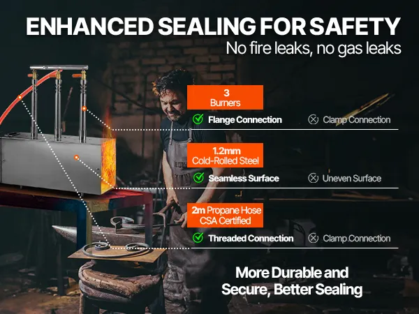 Costruzione e sicurezza migliorate: Realizzata in acciaio inossidabile 201 anticorrosione con corpo senza giunzioni, questa forgia a gas è dotata di bruciatori migliorati con flange e rivetti. Il tubo flessibile approvato da CSA utilizza raccordi filettati per evitare perdite di gas