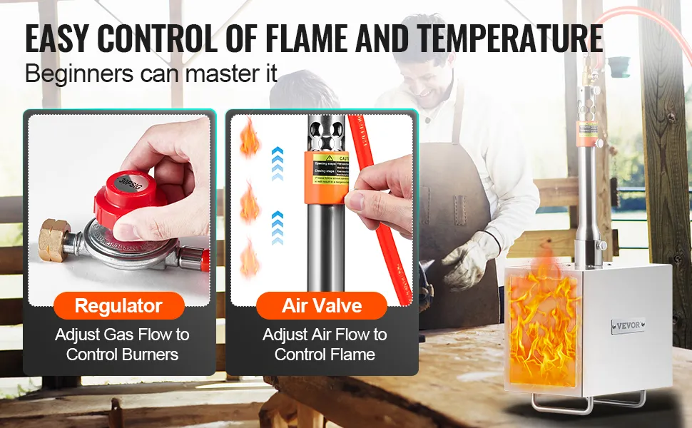 Funzionamento semplice e controllo della temperatura: le forge a gas per la forgiatura sono dotate di 1 bruciatore. La valvola dell'aria regola il rapporto aria/propano e il regolatore controlla il flusso di propano.