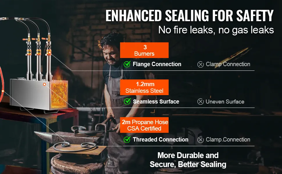 Artigianato e sicurezza migliorati: il corpo della forgia a propano è realizzato in acciaio inossidabile 201 resistente alla corrosione da 1,2 mm con un esterno senza giunture. I bruciatori migliorati con flange e rivetti garantiscono durata ed evitano il rischio di perdite di incendio.
