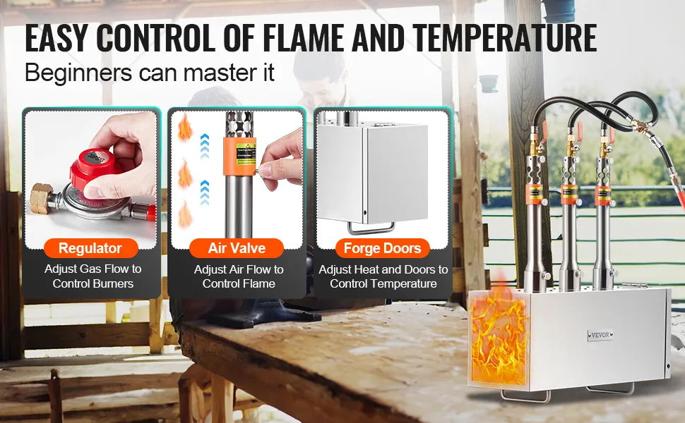 Funzionamento semplice e controllo della temperatura: le forge a gas per la forgiatura sono dotate di 3 bruciatori con valvole regolabili per controllare l'uso di 1, 2 o tutti e 3 i bruciatori. La valvola dell'aria regola il rapporto aria-propano e il regolatore controlla il flusso di propano