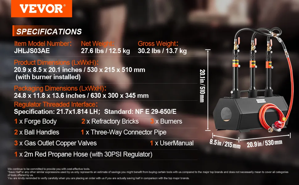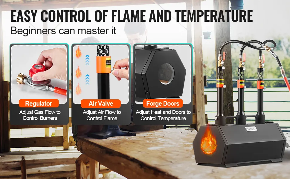 Funzionamento semplice e controllo della temperatura: le fucine a gas per fabbro sono dotate di 3 bruciatori con valvole regolabili per controllare l'uso di 1, 2 o tutti e 3 i bruciatori. La valvola dell'aria regola il rapporto aria/propano e il regolatore controlla il flusso di propano.