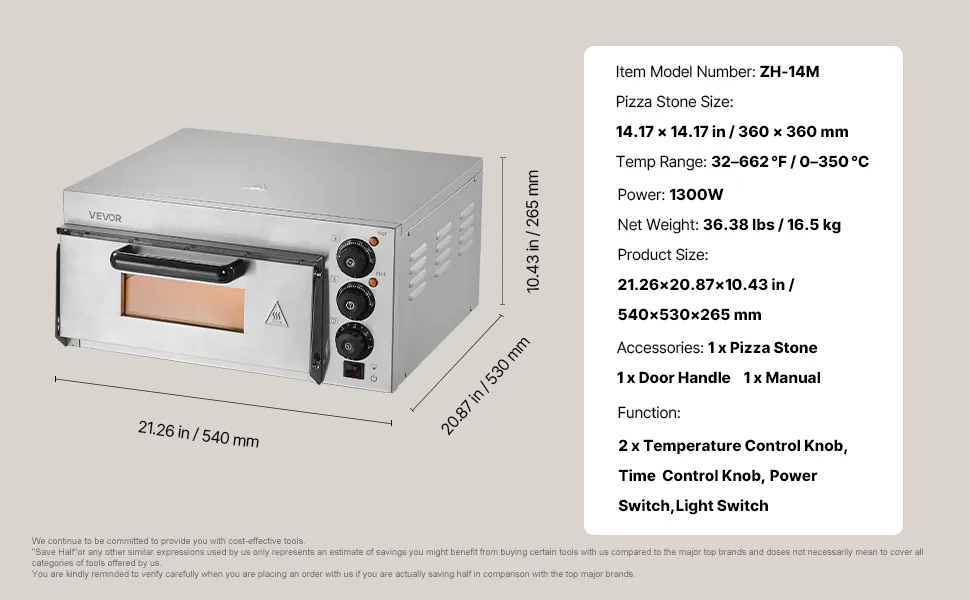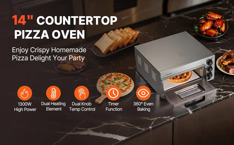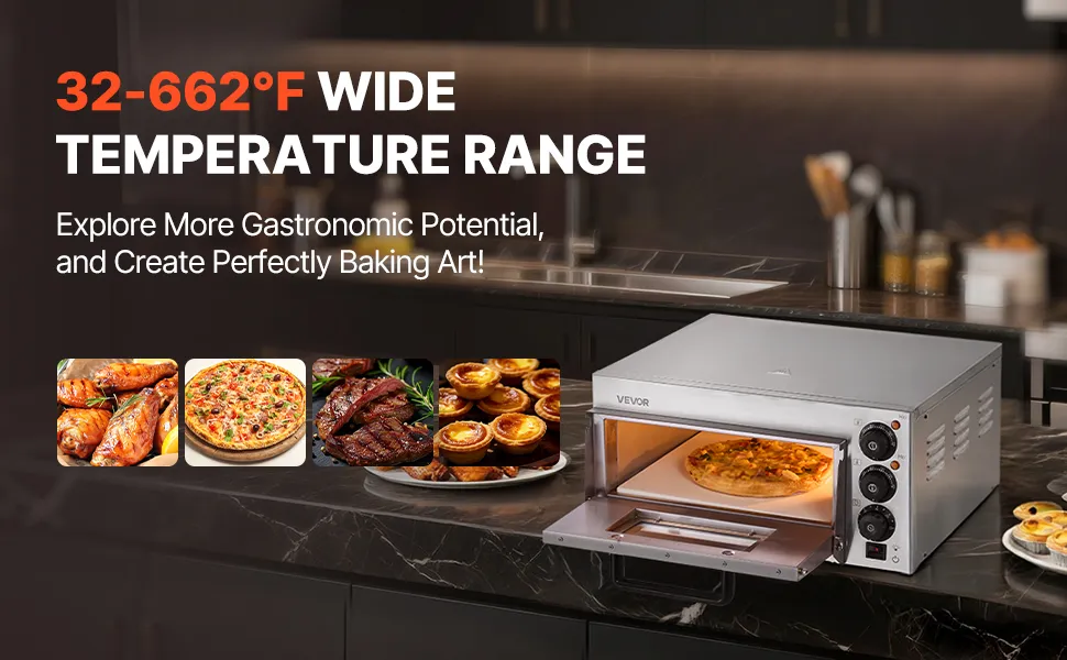Il forno elettrico per pizza VEVOR da 14 pollici è caratterizzato da una struttura in acciaio inossidabile per uso alimentare e da un controllo preciso della temperatura da 122 a 662 ℉/da 50 a 350 ℃.
