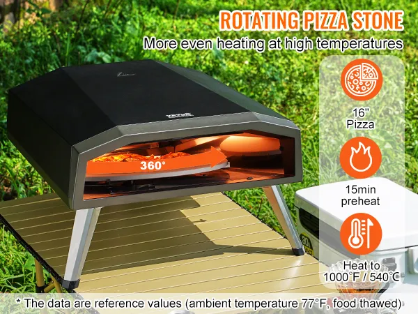 Efficient and even baking: Preheats in 20 minutes, bakes in 90 seconds at temperatures up to 1000°F (540°C). The 210° rotating pizza stone ensures even baking without the need for frequent turning. Ideal for baking 16-inch (406 mm) pizzas and for cooking various meats, fish, and vegetables.