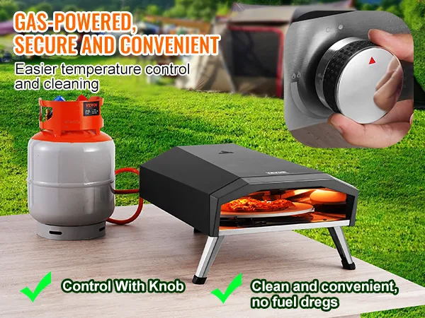 Gas-powered: Gas-powered pizza oven with a rotary ignition knob, offering greater efficiency and convenience. No fuel waste, clean and simple.