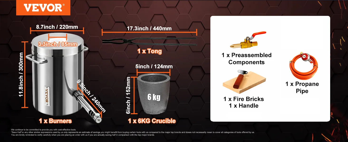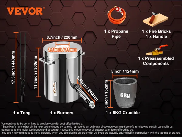 Kit con Accessori Completi: includono tutto ciò di cui hai bisogno.Il forno fusorio viene fornito con un forno, 1 bruciatore, un crogiolo da 6 kg, una pinza ad alta resistenza, un tubo di propano, componenti preassemblati, 1 mattone refrattario, un manico e un manuale. Sarai in grado di esplorare in modo affidabile e sicuro con questo fantastico forno fusorio.