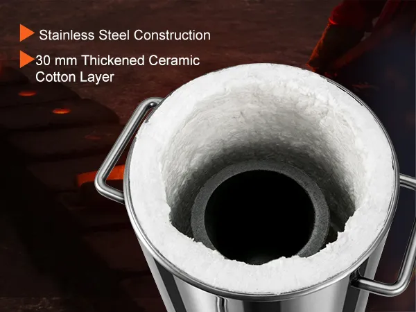 Struttura in Acciaio Inossidabile: il forno a propano è realizzato in acciaio inossidabile robusto, che lo rende più resistente e duraturo. La copertura aggiornata è non saldata e integrata. È inoltre dotato di un crogiolo in grafite ad alta densità. La capacità da 6 kg può sciogliere 13 kg di oro, 7 kg di argento, 6 kg di rame o 1,8 kg di alluminio.